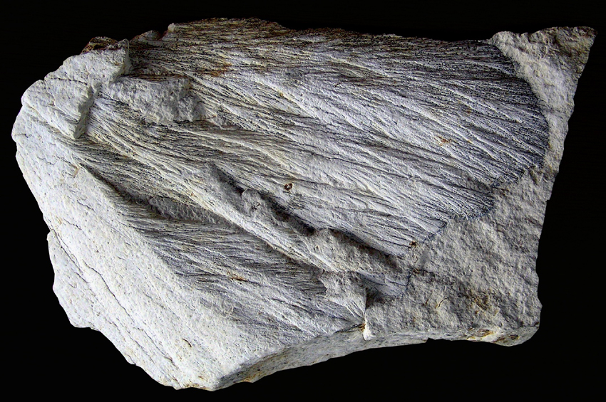 Abb.: Charakteristisch ausgebildete Shatter-Cone-Strukturen in oberjurassischem Kalkgestein (Strahlenkalk) aus dem Impakt-Krater Steinheimer Becken. Größe des Handstücks: 25 x 14 x 10 Zentimeter. Fundobjekt vom südlichen Abhang des Galgenbergs.