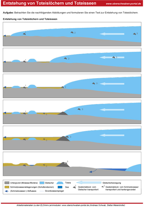 Mit dem Arbeitsblatt wird die Eintstehung von Toteislöchern bzw. Toteisseen sowie die Bildung von Kesselmooren beim Abschmelzen von Gletschern erarbeitet.