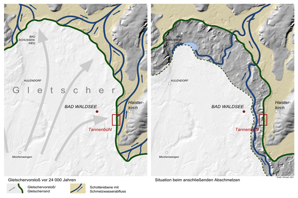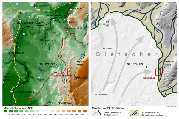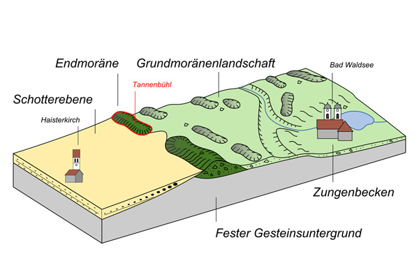 Die Landschaft rund um Bad Waldsee ist stark von der Eiszeit geprägt. Der Rheingletscher stieß vor rund 24 000 Jahren aus den Alpen bis nach Oberschwaben vor und lagerte einen mächtigen Endmoränenwall ab. Auf dem geologischen Lehrpfad im Tannenbühl lässt sich dieser Wall erklimmen und eine große Vielfalt an weiteren eiszeitlichen Phänomenen entdecken. An den einzelnen Erlebnisstationen gibt es Wissenswertes für Erwachsene sowie Spielanregungen und interaktive Quiztafeln für Kinder. Darüber hinaus finden Sie hier im Oberschwaben-Portal zu jeder Station zusätzliche Informationen zur Entstehung der glazialen Landschaftsformen in Oberschwaben, die sich per QR-Code auch vor Ort abrufen lassen.